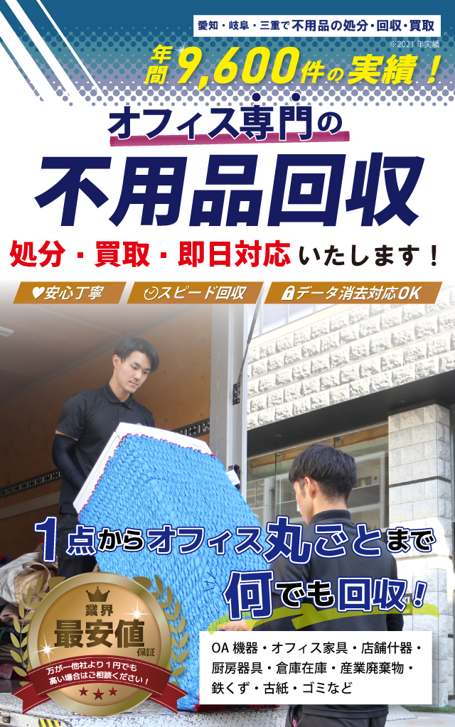 お任せクリーンは、愛知・名古屋・岐阜・三重でオフィス・店舗・法人専門の格安不用品回収・処分、不用品買取を行っております。オフィス移転・閉鎖時のオフィス家具やOA機器、店舗の改装・閉鎖時に出た不要な棚や什器、飲食店の厨房機器・調理器具など、不用品はなんでも格安で回収・処分いたします。倉庫の余剰在庫や工場の設備・廃棄物、老人ホーム・ケアハウスのタンスや棚などの家具や退去時の不用品、教室・事務所などの移転・閉鎖時に出る机や椅子などの不用品なども回収いたします。